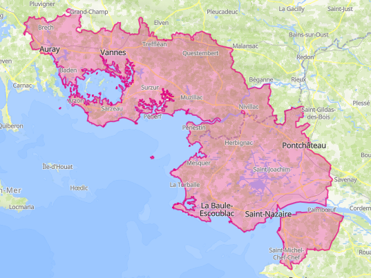 Saint Nazaire - Pornichet - La Baule - Guérande - Le Pouliguen - Le Croisic - La Turballe - Mesquer - Piriac sur Mer - Pénestin - Herbignac - La Chapelle des Marais - La Roche Bernard - Nivillac - Camoel - Ferel - Muzillac - Questembert - Sarzeau - Arzon - Ambon - Saint Gildas de Rhuys - Vannes - Elven - Auray - Baden - Saint Brevin les Pins