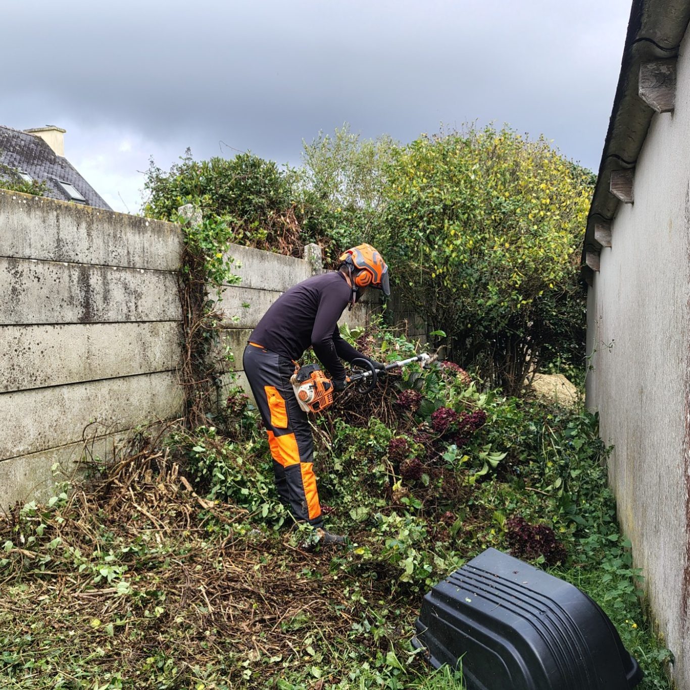 Ronces, herbes hautes et broussailles fauchées, évacuation des déchets.